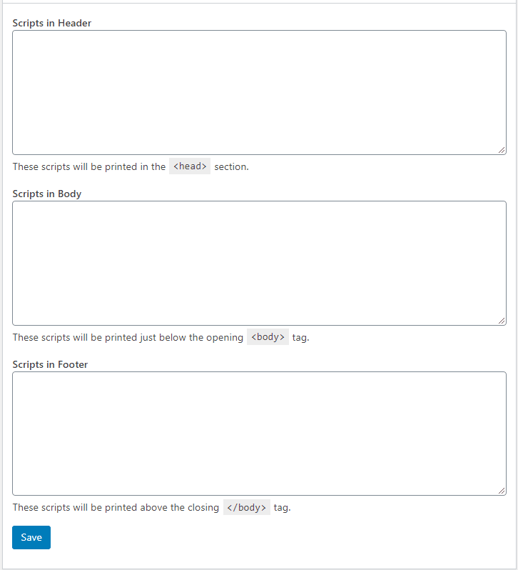 head タグの中、body タグの開始直後、 body タグの終了直前に HTML を挿入できます。