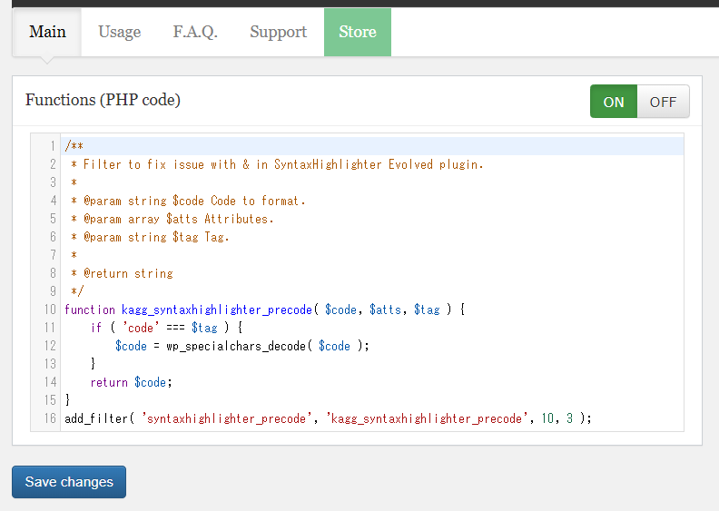 My Custom Functions プラグインを利用します。テーマを直接変えるのではなく、プラグインにコードを差し込んでもらうことができます。プラグインの設定からコードを追加できます。