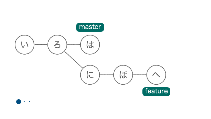 まずは feature ブランチの付け根の位置について見てみます。master と feature ブランチの「共通の祖先」から分岐する部分が付け根です。例では「ろ」から「に」の部分ですね。