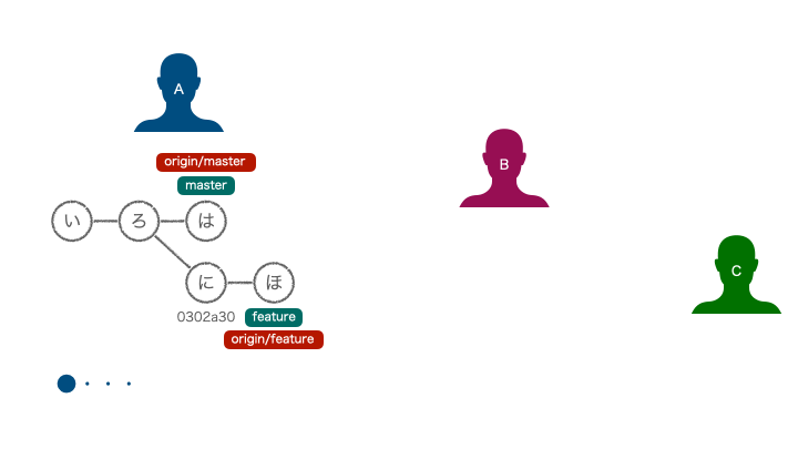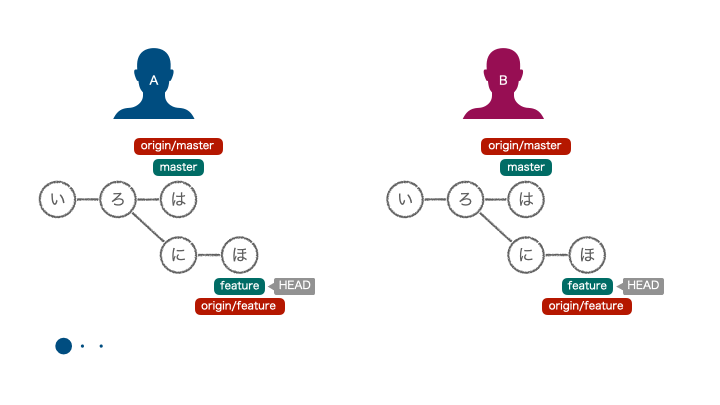 A さんと B さんという人物が登場します。二人とも feature ブランチをチェックアウトしているとします。