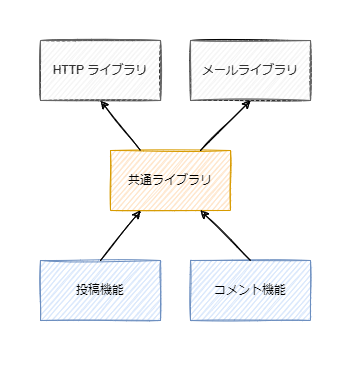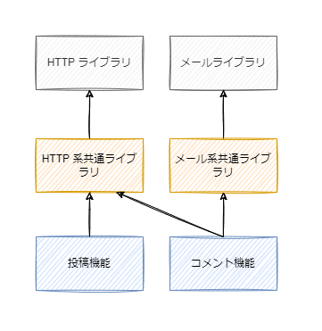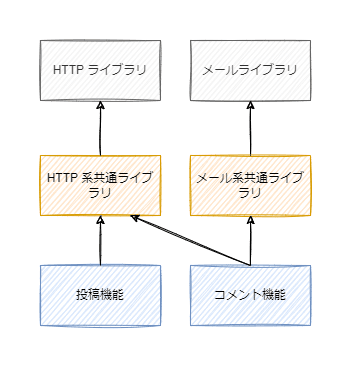 ここで、 HTTP は「投稿機能」でも「コメント機能」でも利用するので問題ないのですが、メール送信処理は「コメント機能」でしか利用しないことが判明しました。しかし「コメント機能」は「共通ライブラリ」に依存し、「共通ライブラリ」は「メールライブラリ」に依存しているため、使用しない「メールライブラリ」を参照してしまいます。