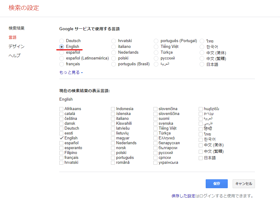 まずは Google の設定を変えます。日本語設定のままだと英語でググっても日本語のページが優先されて表示されるためです。Google サービスで使用する言語を English に変更します。
