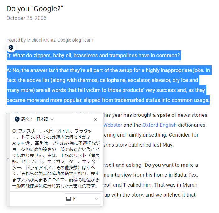 次に「原文と翻訳文が両方表示されること」です。翻訳は完ぺきではないので、英語独特の言い回しをうまく翻訳できなかったり、逆に翻訳しなくていい固有名詞を翻訳したりするからです。上記のスクリーンショットだと、商標について話しているのに「ファスナー」は一般名詞だよなと思いますが、原文は「zippers」なので商標であることがわかります。