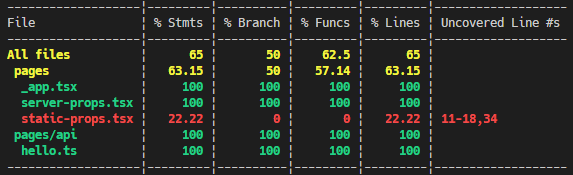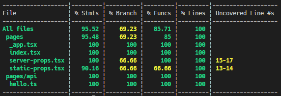 jest のカバレッジはきれいに出ています。これならばカバレッジ 100% を維持できるかもしれません(カバレッジを維持するためのテストに意味があるかはおいといて)。各ページのプロパティの取得部分 (getServerSideProps や getStaticProps) と React 部分はそれぞれ別でテストすることになるので、細かい粒度での「単体」テストにはなってしまいます。