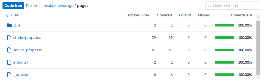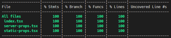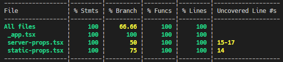少々複雑になったので、 GitHub にソースを上げました。実装自体はかなり単純で、 getServerSideProps と getStaticProps のページをそれぞれ1つづつ用意した程度です。条件分岐のカバレッジも見たかったので、それぞれのページにクエリパラメーターによって画面表示を変える処理を入れています。