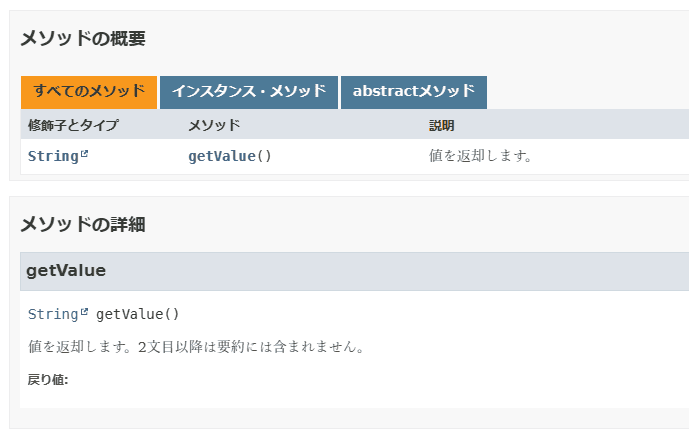 String getValue();これは論文を書く時の癖・・・というわけではなく(日本語の論文では全角の終止符「.」を使います)、 checkstyle などのツールの都合からこうなっていると考えられます。