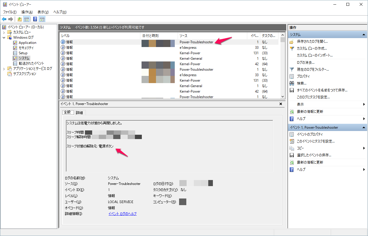 イベントビューアーの一覧から、ソースが Power-Troubleshooter となっている項目を探します。見つけるのが大変な場合は、左側に「現在のログをフィルター…」という項目があるのでそれをクリックし、イベントソースに Power-Troubleshooter を設定して OK をクリックします。