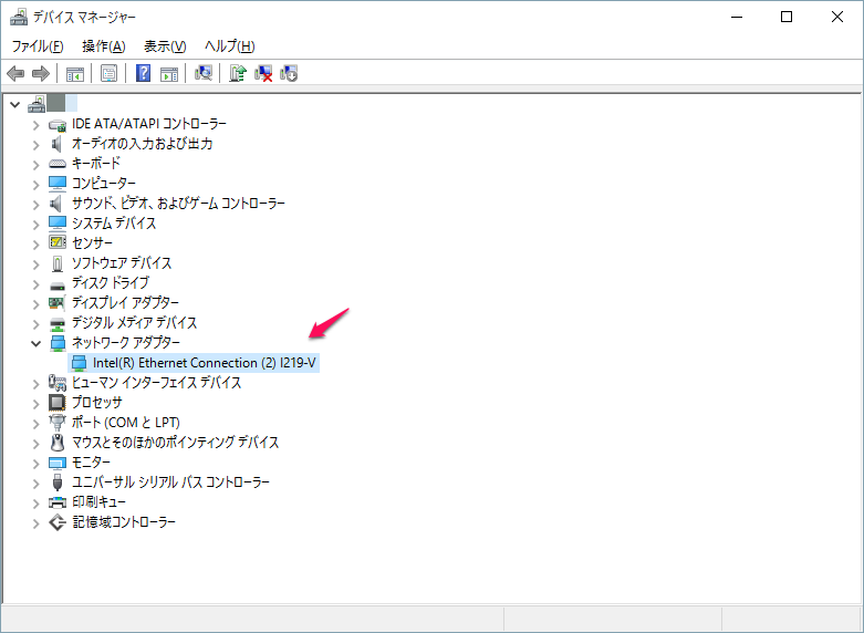 マウス・キーボードの時のように、デバイスマネージャーからネットワークアダプタのプロパティを開きます。
