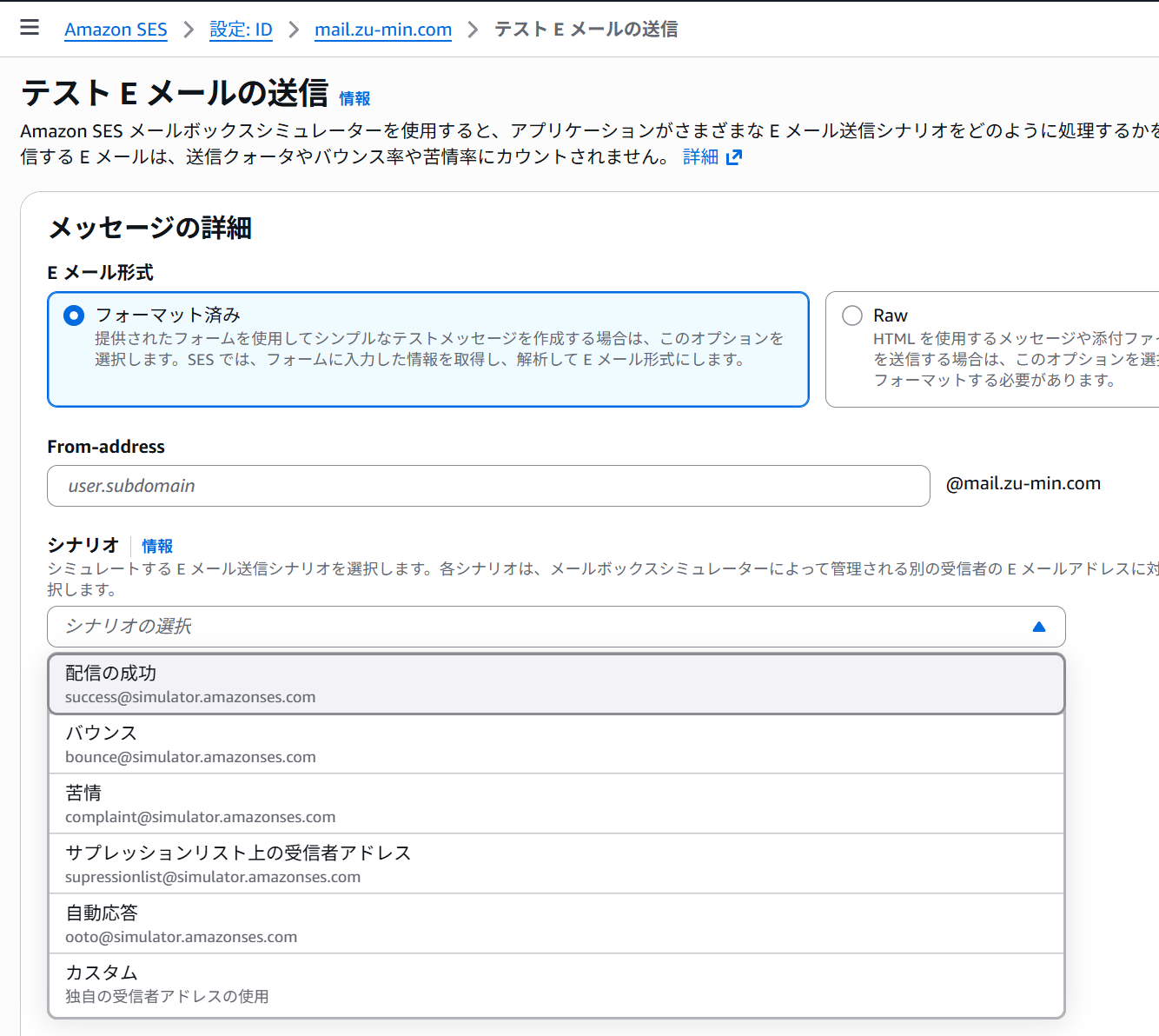 あまりいいことをしている気分ではないですが、いろいろ試してみましょう。 そういえば SES のテストメール送信時にシナリオっていう項目がありましたね。