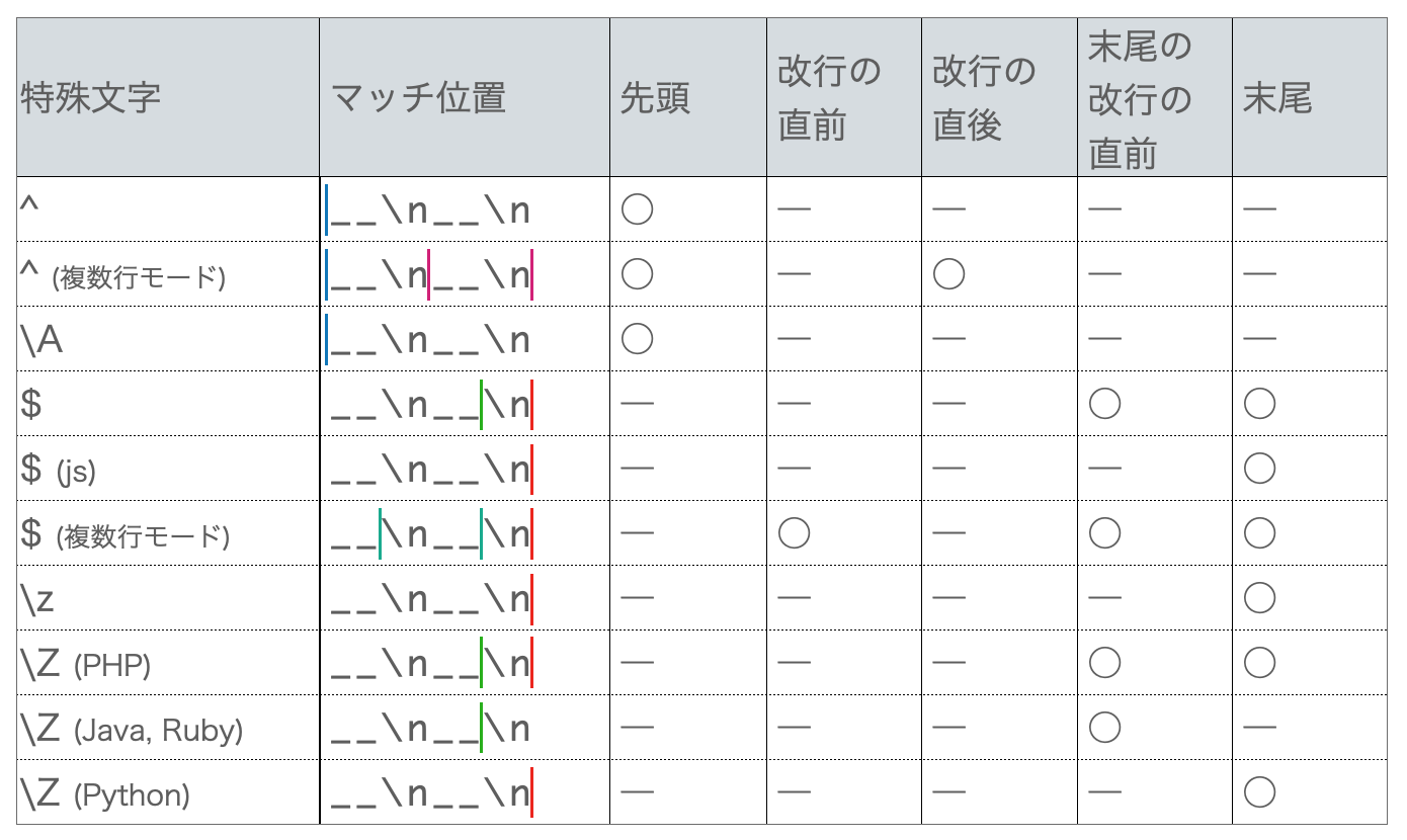 もっと単純にまとまるかと思いきや、言語ごとにばらばらという結果になりました。完全に文字列の開始と終了にマッチさせたい場合、 js は ^$、PHP、Ruby、Java は \A\z、Python は \A\Zを使用する、といった形で使い分けるのがよさそうです。