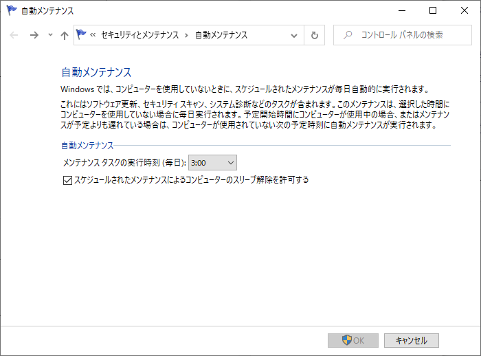 PCを使っていない、かつPCの近くにいる人が起きている時間がよいので、朝起きてすぐくらいがよさそうです。ただ、在宅勤務で使用するPCの場合は、朝に設定すると業務開始直後にメンテナンスが動いて PC が遅くなる可能性もあります。PC を使っている場合は実行時刻を自動でずらしてくれるようですが、気になる場合は終業直後くらいがよいかと思います。